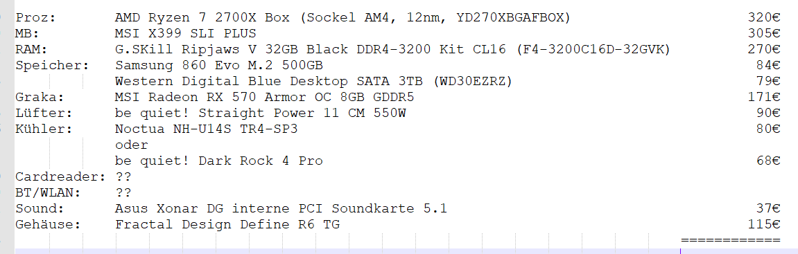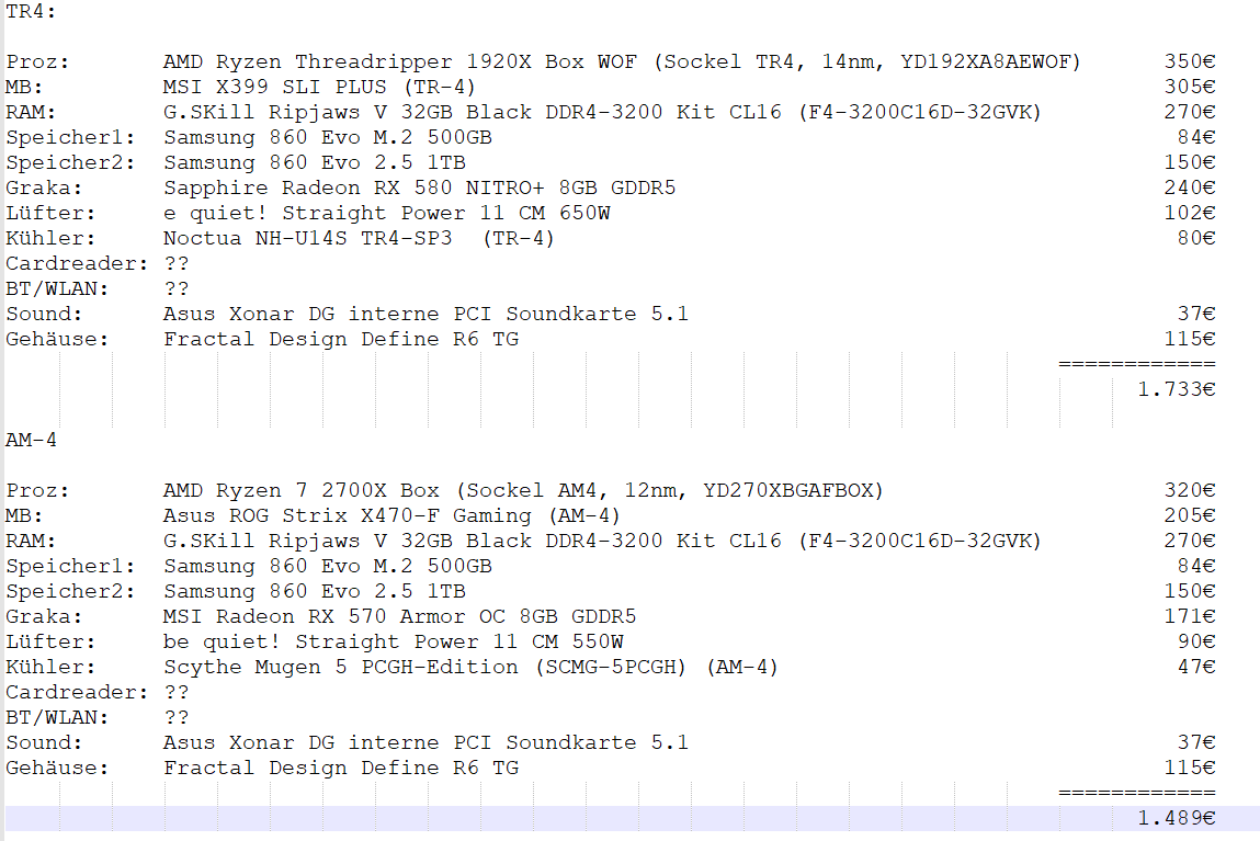 RYZ3N schrieb:Nimm meine Konfiguration für 2.560,— Euro, nimm die Radeon Pro WX 4100 raus und ersetze sie gegen eine MSI Radeon RX 570 Armor 8GB und nimm die 970 EVO raus und ersetze sie gegen eine HDD deiner Wahl.