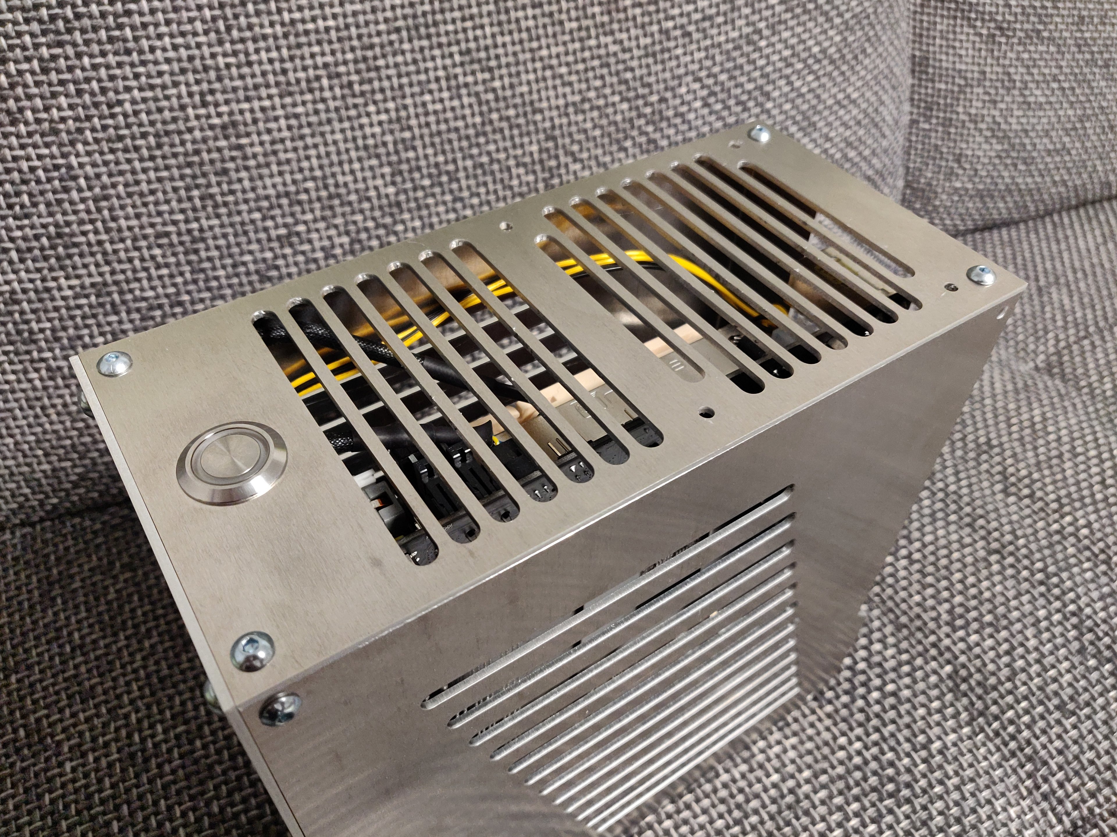 Da wo die GPU ist, war vorher ein HDPlex Netzteil. Er hat also den Ausschnitt für die GPU vergrößert. Außerdem ging das nur per Riser-Kabel.