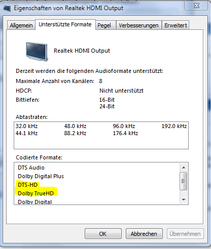 nunja... jetzt suche ich schon fast 2 Stunden lang im Internet und werde dennoch nicht fündig. Ich suche zur Zeit einen guten Multimediaplayer der das vorliegende Tonmaterial (komprimiert) einfach über HDMI durchschleift. Ich versuche seit Tagen an meinem Verstärker die blaue "DTS-HD Master Audio" Lampe zum leuchten zu bringen. Ich habe jetzt auch einen Film von einer Demo Bluray vom Freund, liegt komplett in DTS-HD vor, allerdings schafft es kein Player dieses Signal einfach an meinen Verstärker weiterzugeben, denn an diesem scheint höchstens nur das dts Symbol.
