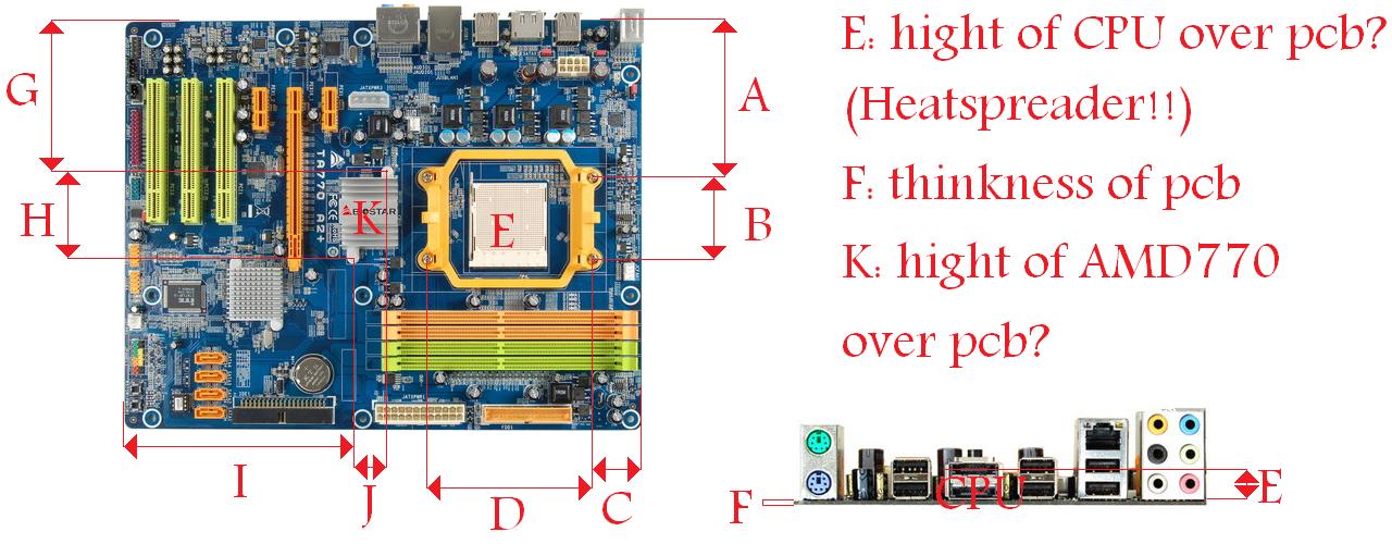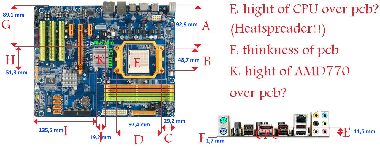 ich würde mir aber gerne ein eigenes Gehäuse + Kühlung dafür bauen und brauche daher für die Planung ein paar Maße( siehe angehängtes Bild)