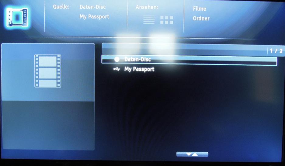Da heißt entweder habe ich eine Handelsübliche CD/DVD/BD eingelegt und der OPPO startet (wenn Autostart aktiv ist) sofort mit der Wiedergabe oder aber man landet wenn es eine selbst gebrannte CD/DVD/BD ist auf dem Haupttmenü und der OPPO gibt aus er hat eine Daten Disk gefunden. Nun wählst du auf dem Homescreen aus auf was du zugreifen willst Bilder/Musik/Video. Im nächsten Screen kannst du auswählen ob du auf die Daten Disk oder (falls angeschlossenen) USB Geräte zugreifen willst. Sobald du auf der Daten Disk oder dem USB Laufwerk zugreifst kannst du oben die Ansicht Optionen ändern wenn gewünscht.