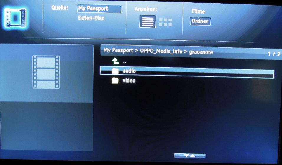 Ich bevorzuge hier die Ordner Ansicht da ich mich nicht durch irgendwelche "Bling Bling Coverflow in 3D" Ansichten durchwühlen will wo alle Filme oder Musik Inhalte zusammen gewürfelt werden. Gleichzeitig bietet der OPPO auch so einen Modus nicht an sondern auch in der Ansicht Filme anstatt Ordner wo er alle Filme der Daten Disk oder des ausgewählten USB Geräts anzeigt werden die Filme Alphabetisch geordnet und Links die dazu gefundenen Infos von Gracenote. Zusätzlich können noch erweiterte Infos auf Wunsch von Gracenote eingeblendet werden.