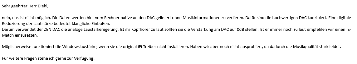 Ich weis nicht ob ein DAC ausreichend wäre, da der ifi zen CAN die gleiche Problematik aufweist. Auch hier ist ein Drehregler verbaut.... Meiner Meinung nach müsste ich also das gleiche Problem haben, wenn ich jetzt nur den DAC tausche und den CAN weiter nutze. Dann kann ich zwar die Lautstärke des neuen DAC via Windows Regeln, sobald ich den ifi DAC dann aber dazu schaltet, gilt wieder nur der Lautstärkeregler des CAN... (vermute ich - wie bereits erwähnt, bin ich aber auch nicht fit genug in dem Thema)