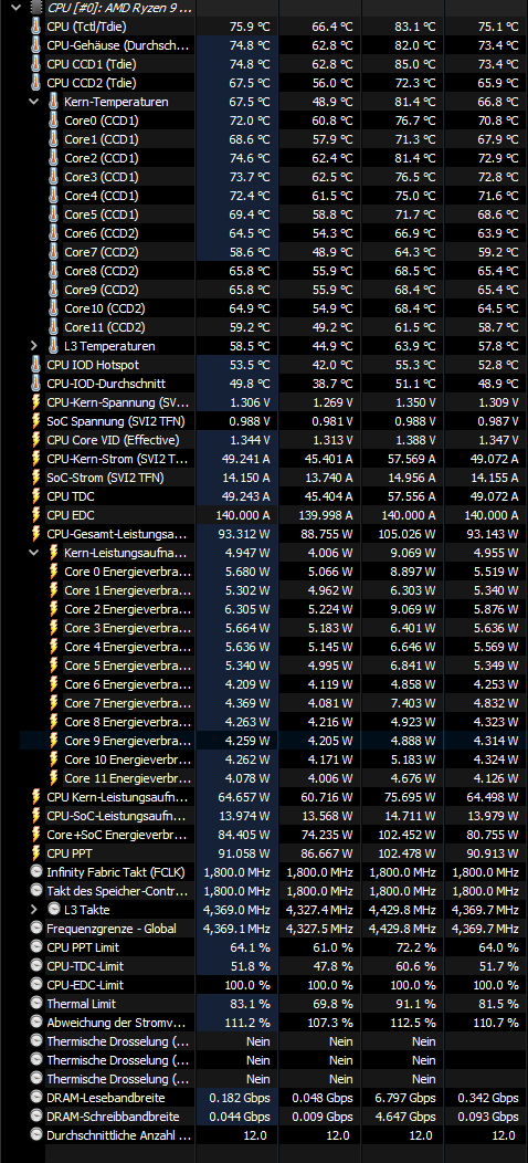 Da anscheinend mein Mainboard seit der RMA bei MSI eine Macke hat und zeitweise einfach mal 140 Ampere EDC im leerlauf oder bei leichter Last in die CPU drückt, wollte ich das Grundgerüst wechseln. Die CPU hat im Leerlauf 52°C und wird durch eine Arctic Liquid Freezer II 420 AIO gekühlt, unter Last sind das im Desktopbetrieb (Video schauen) gerne mal 75°, beim Spielen komme ich deutlich über 85°C und je nach Spiel wird thermisch gedrosselt bei 90°C.