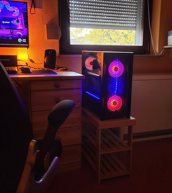 Anbei mal ein Foto von meiner PC Ecke, vielleicht habt ihr eine Idee, die sich auch um die 30 bis 40 Euro bewegen. Selbst schreinern kann ich leider nicht, habe zwei linke Hände, bin froh, dass ich PCs selbst bauen und aufrüsten kann.