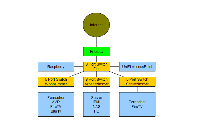 Ein PC (Main1) wird permanent über das LAN angebunden, 2 Laptops werden über WLAN betrieben. An einem der Laptops (Main2) wird viel HD gestreamt.