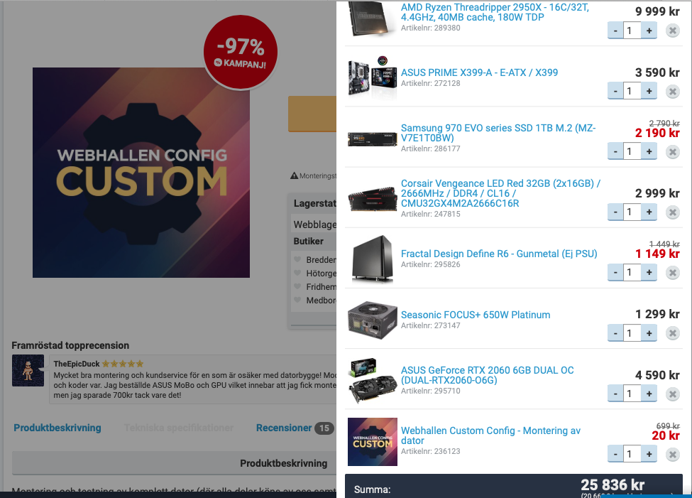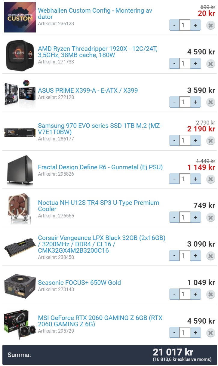 Das ist ja absolut überteuert (38000 schwedische Kronen sind knapp 3600 EUR) und der 2950x macht sowieso P/L-technisch überhaupt keinen Sinn, da er nur ca. 10% mehr leistet als sein Vorgänger, aber viel teurer ist.