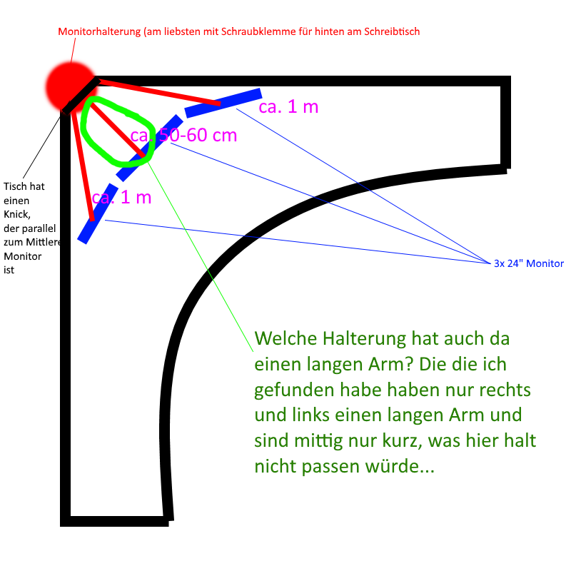 dass ich einen Ecktisch habe und die Halterung per Schraubklemme gerne hinten an der Schreibtischkante hätte. Die ist hinten dafür etwas abgeschnitten, sodass sie parallel zum Hauptmonitor in der Mitte ist. (Siehe Skizze).