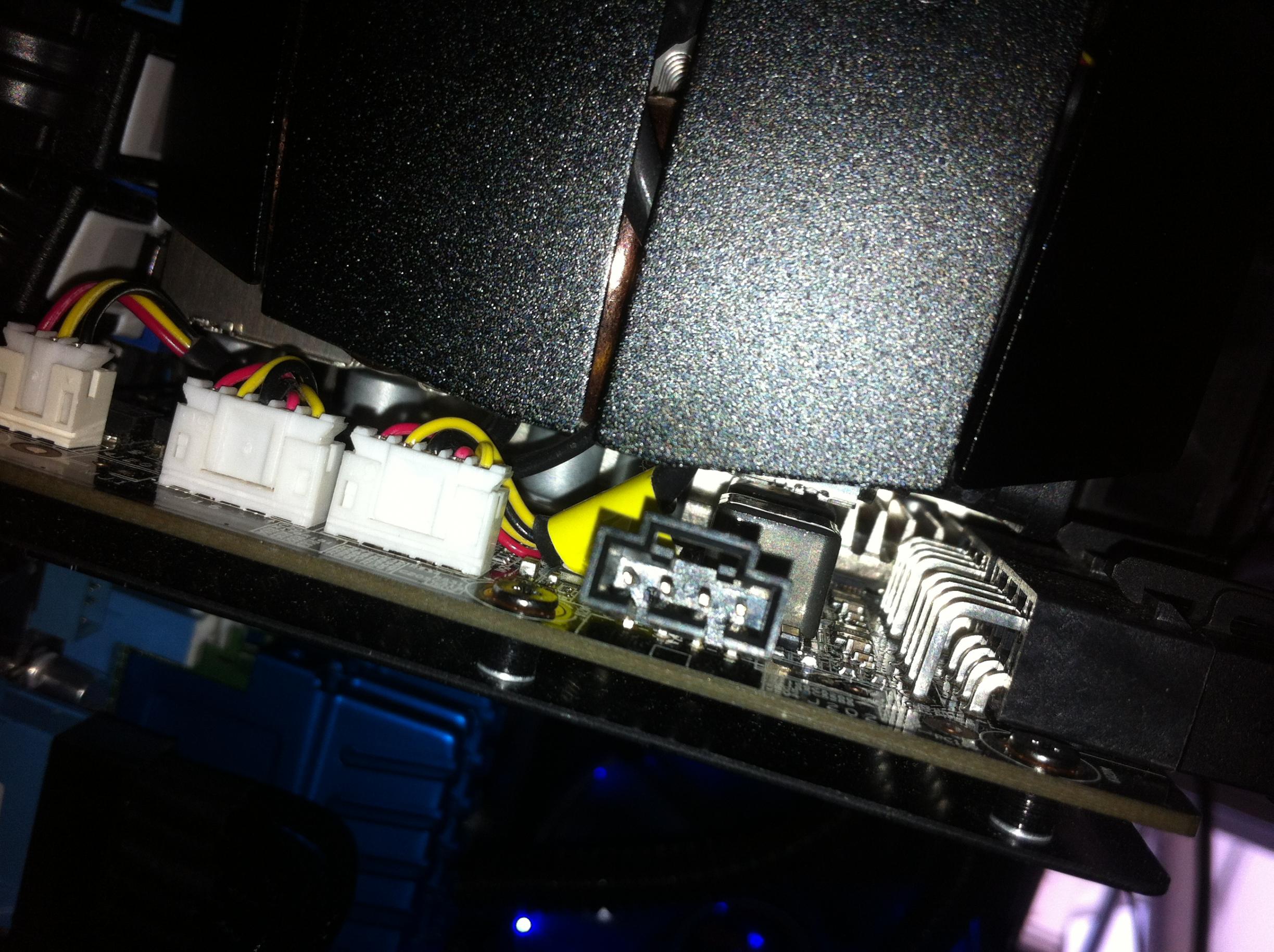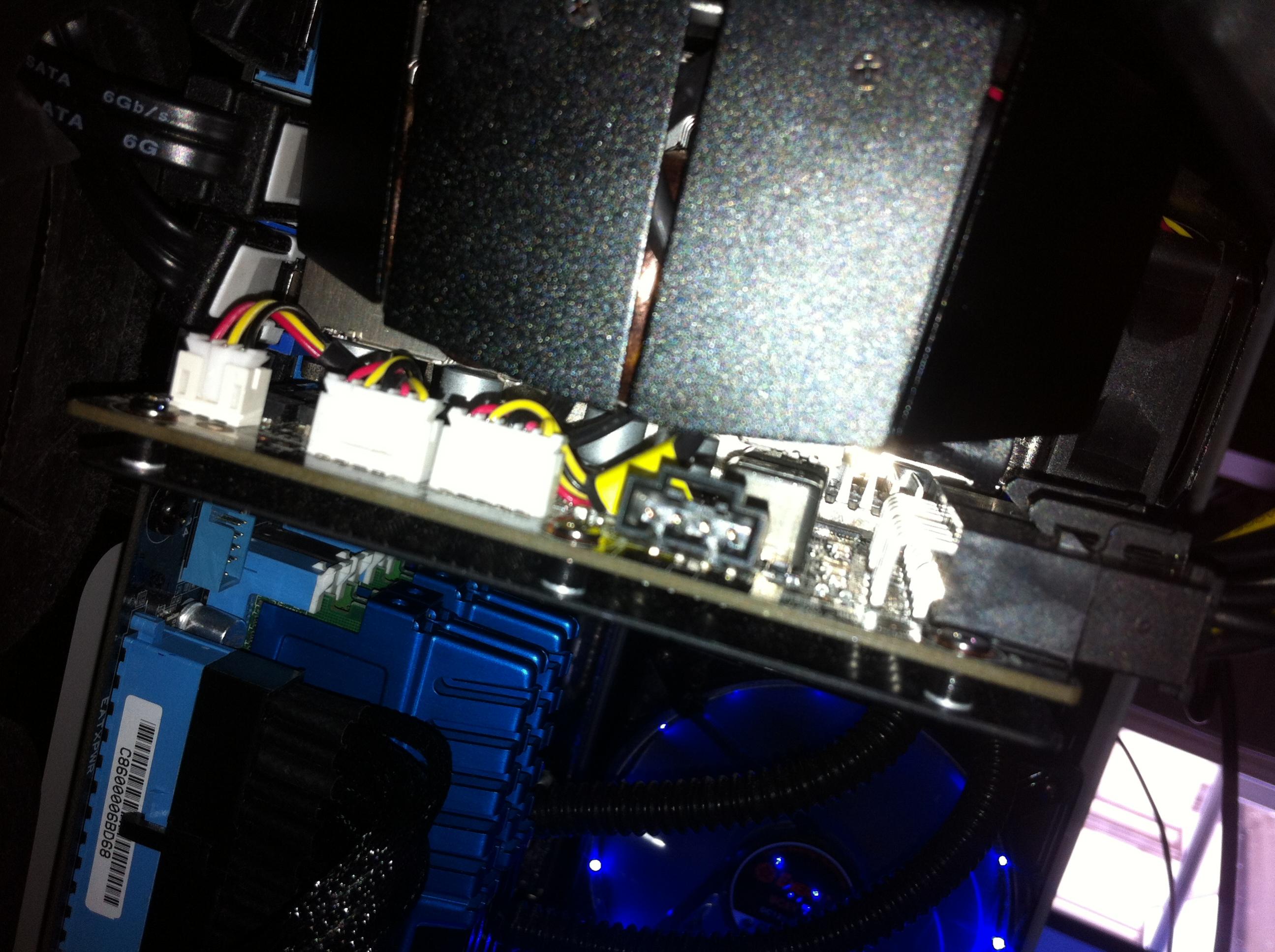 Es handelt sich um einen Anschluss an meiner Gigabyte GTX 680 SOC mit 4 Pins, den ich gerne an mein Mainbboard respektive Lüftersteuerung anschliessen möchte mit einem 3 Pin Adapter.