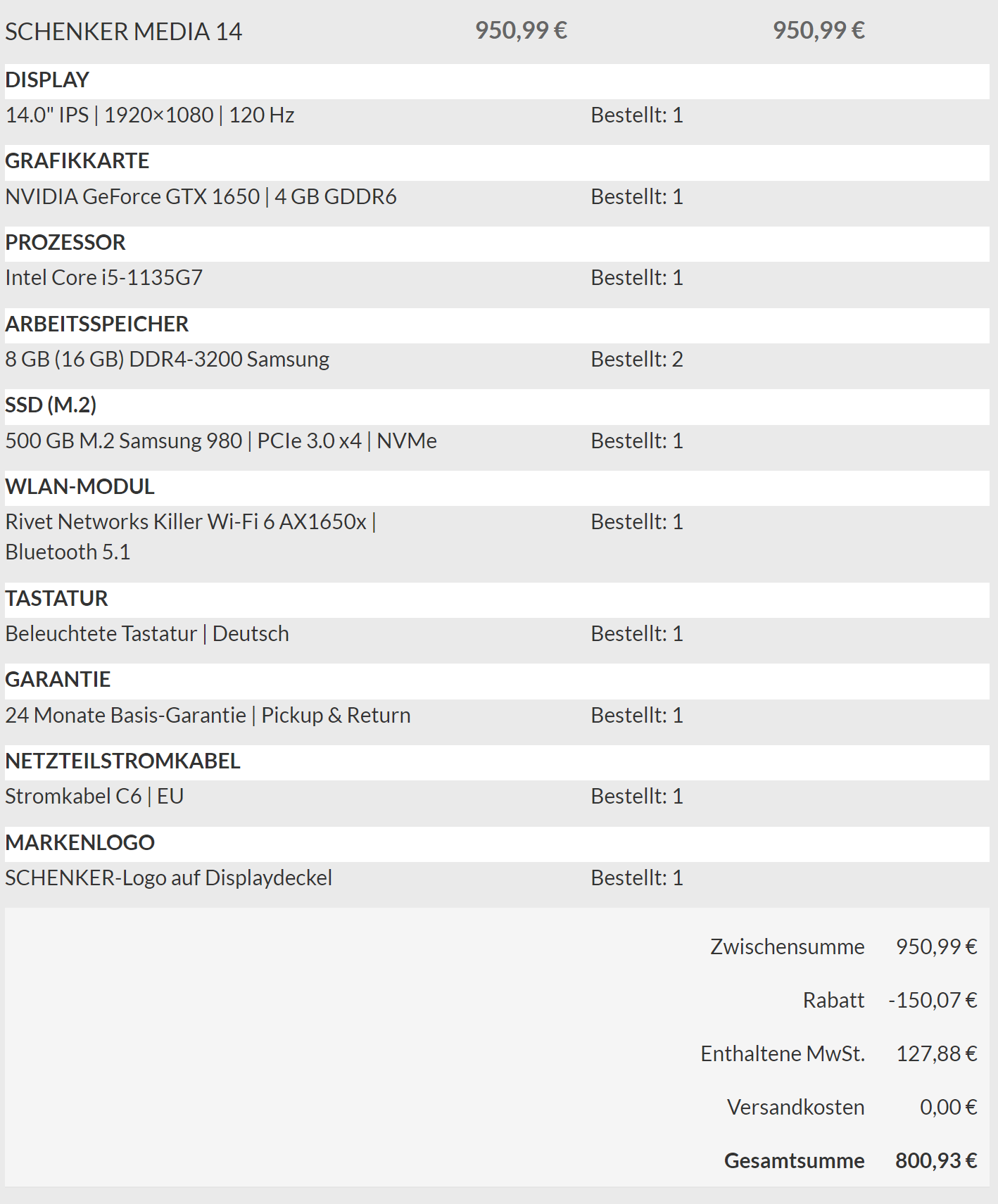 Was mir bei meinen bisherigen Recherchen ganz gut gefallen hat, ist zum einen das Schenker Via 14 (late 2020) und zum anderen das Schenker Media 14. Letzteres wirkt nicht ganz so elegant, ist aber hardwaretechnisch besser aufgestellt, bei quasi identischem Preis, oder?