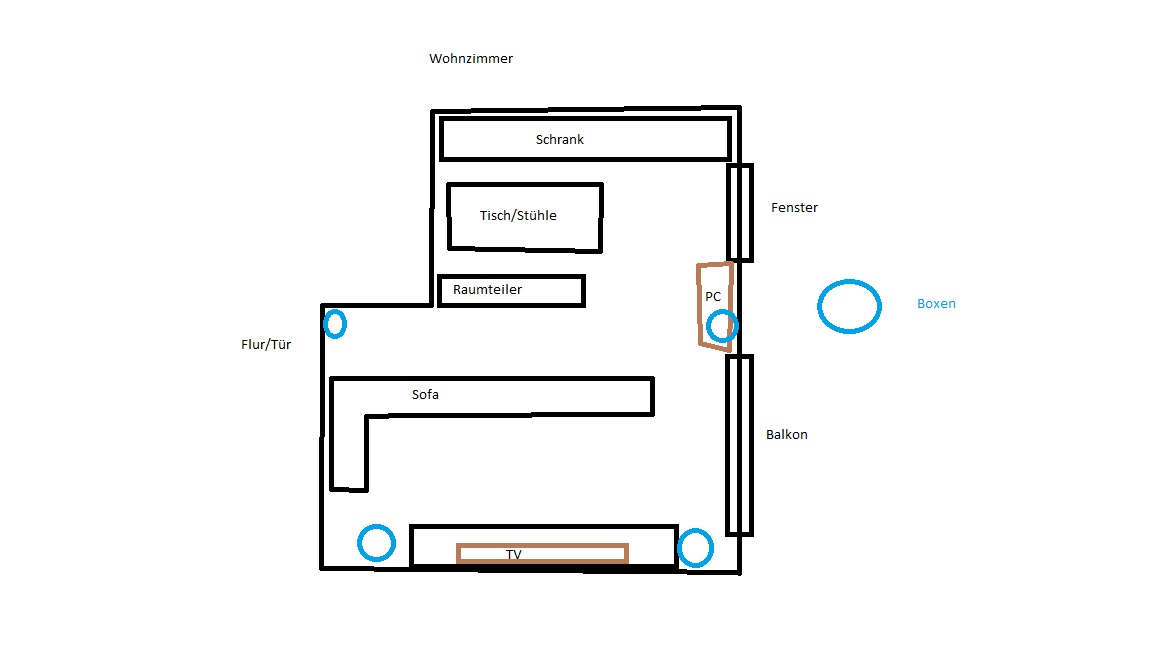 Wohne im Erdgeschoss, habe über mir und ca 8m gegenüber des Fernsehers jeweils die Wohnzimmer meiner Nachbarn. Betonboden mit Teppich vorhanden. Preis ca. 200 Euro +-