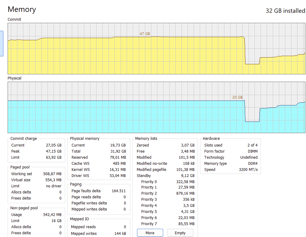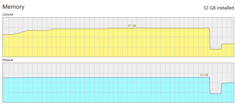 lass dir gesagt sein, dass die commitgröße reine virtuelle (pre-)allocation ist, das heißt, der jew. prozess lässt durch das os hier speicherbereiche zusichern, die am ende u.u. niemals genutzt werden. es ist eine anmeldung an potenziellem bedarf, der aber zugesichert wird und dann im fall des falles über ram oder behelfsmäßig swapspace realisiert wird.