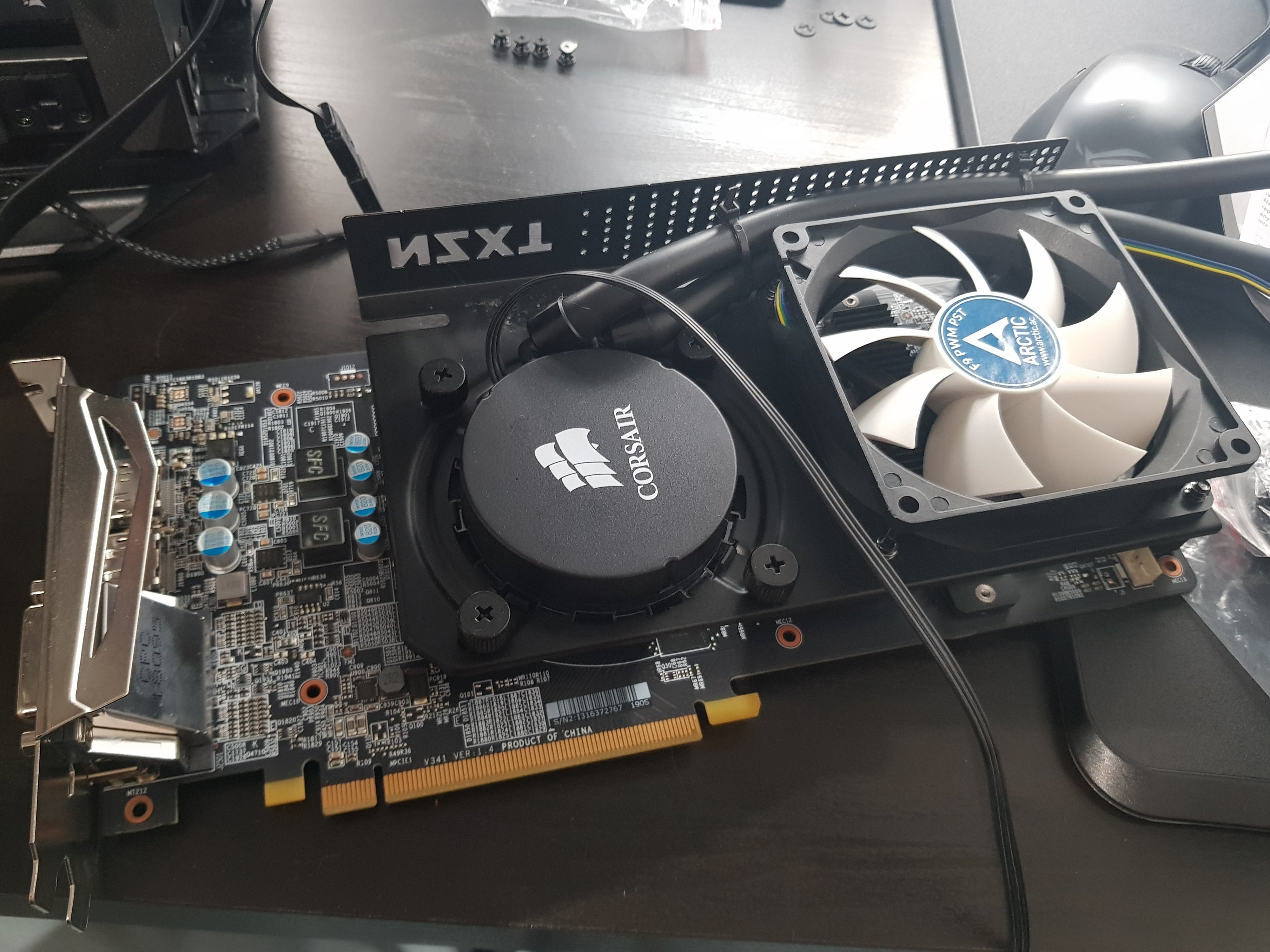 • 1 Kraken G12 mit Corsair H55 - im Prinzip damit exakt (auch gleiche GPU) wie im Video oben. Allerdings habe ich die Lüfter der H55 gegen PWM Lüfter getauscht und sie per Adapter an die GPU direkt angeschlossen. Finde ich (i) eleganter und (ii) wäre es beim mITX Mainboard sonst knapp geworden für die Lüfteranschlüsse.