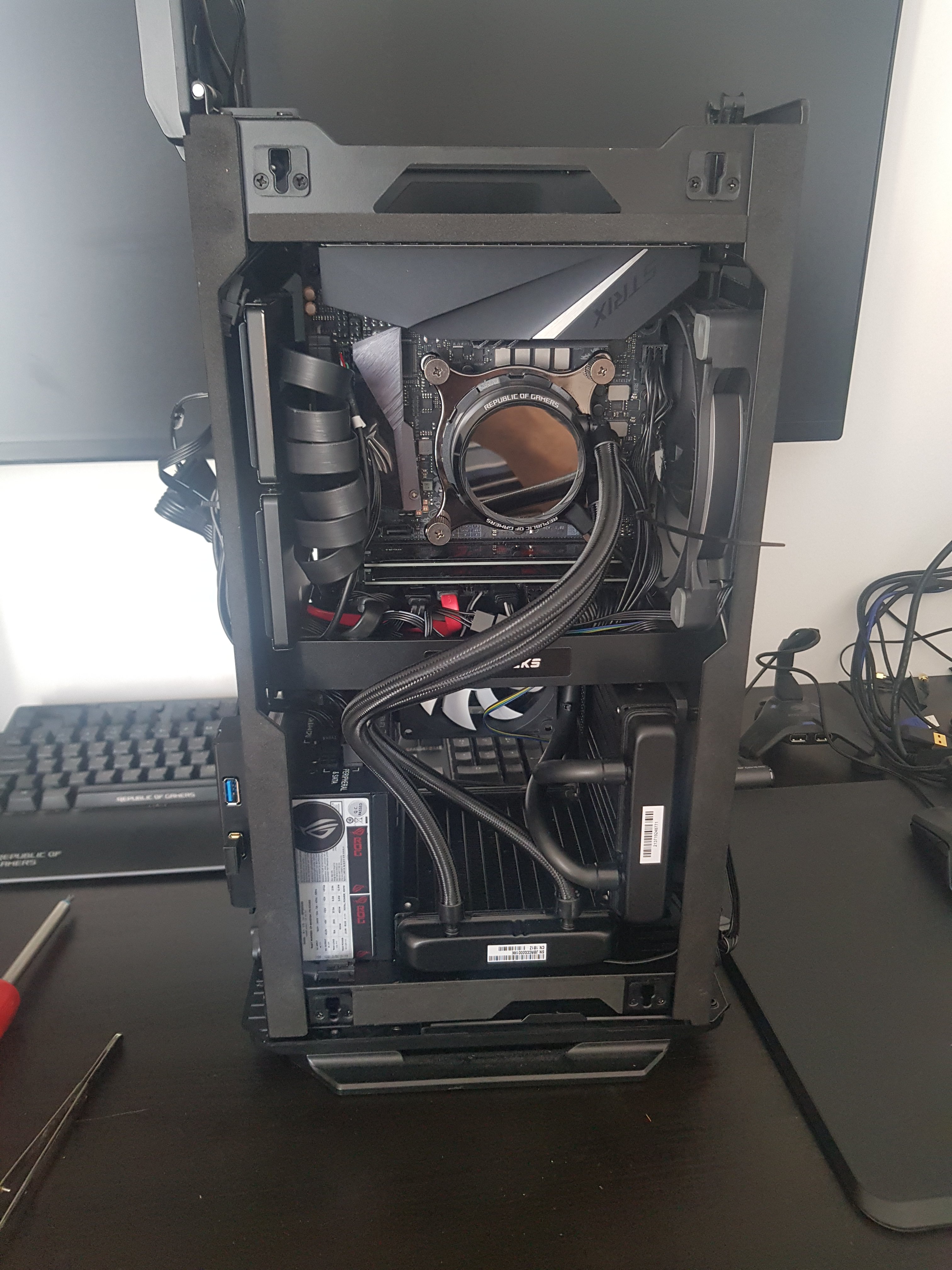 • Die Dual-AIO Variante geht, ist aber sehr sehr knapp im Raum. Bei mir passt alles auf den Millimeter genau - größer hätten weder die Radiatoren noch die Grafikkarte sein dürfen. Ich musste die Karte von der Orientierung auch Lüfter-nach-innen montieren (anders als vom Hersteller empfohlen). Anders war kein Platz. Wer kann sollte sich jedenfalls Slim-Lüfter fürs Gehäuse besorgen - der extra cm auf der Seite hilft