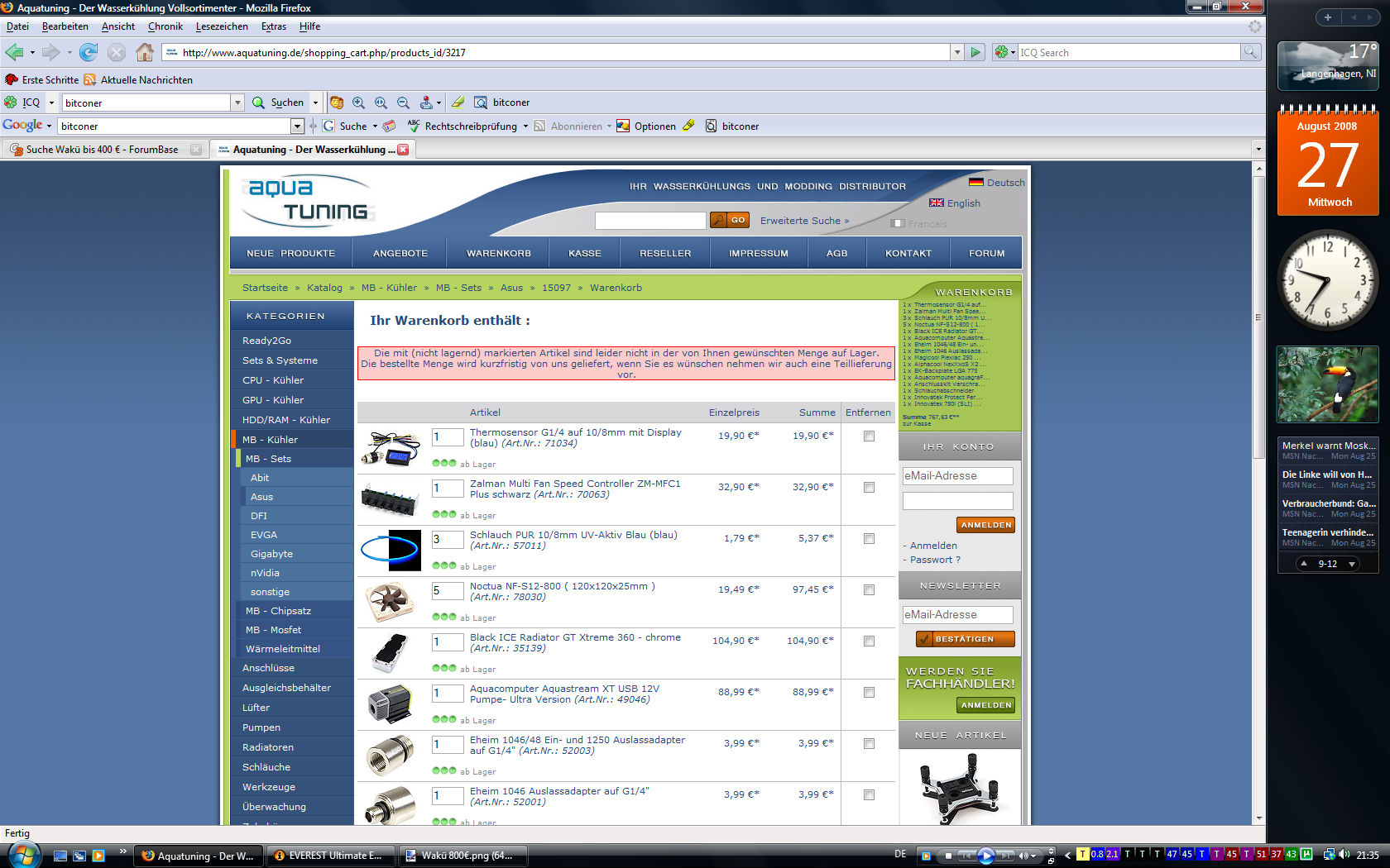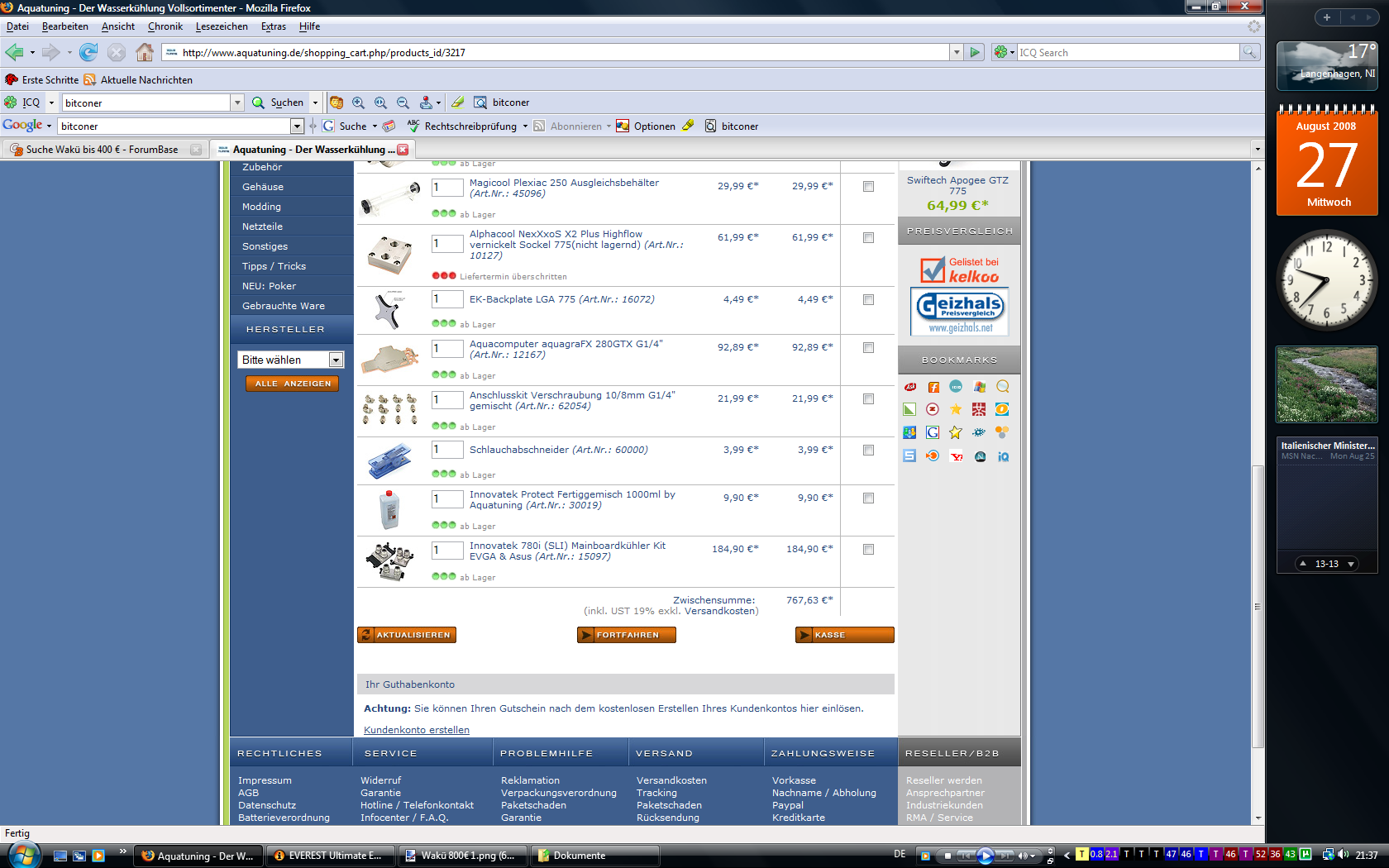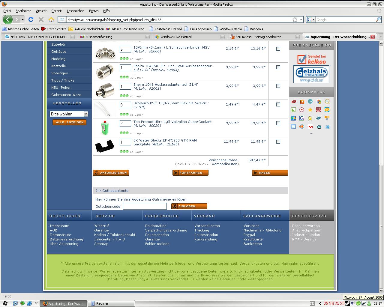 Habe vor die Grafikkarte mit der WAKÜ zu kühlen sowie die CPU und das Board so weit das Geld eben reicht. Als Preisgrenze hatte ich an 350-400 € gedacht. Da ich mich mit den ganzen Anschlüssen nicht auskenne wäre es super wenn Ihr mit euren Empfehlung immer ein komplettes System zusammen stellen könntet (mit Angabe welcher Schläuche usw.). Wie man sicherlich oben erkennen kann wurden die ganzen Komponenten fürs Übertakten gekauft. Über eure Vorshläge freue ich mich jetzt schon.