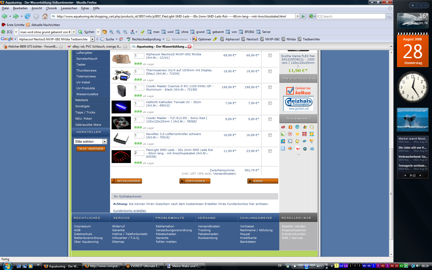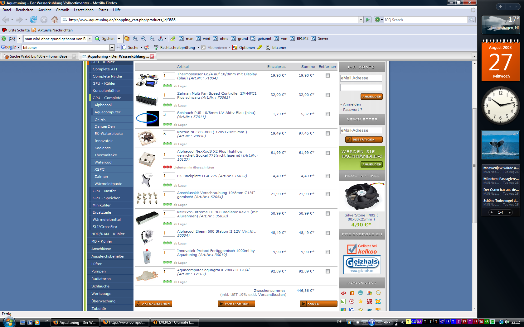 habe wie unten den zu ersehenden Computer und möchte diesen nun auch mit einer Wasserkühlung erweitern. Hatte mir auch überlegt ne gute Luftkühlung zu besorgen wie den Thermalright IFX-14 habe mich aber gegen diesen Entschieden da ich meinen PC optisch noch ein bissle mehr aufwerten will und er auch zum Übertakten gedacht sein sollte. Mein System sieht im mom. wie folgt aus: