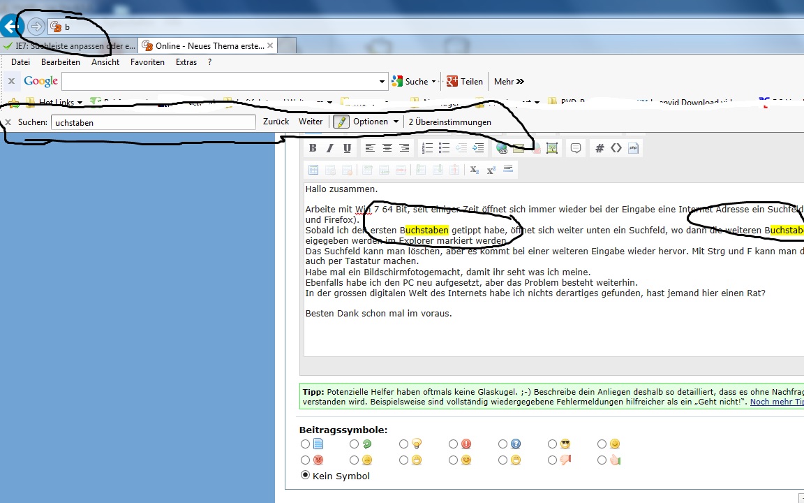 Arbeite mit Win 7 64 Bit, seit einiger Zeit öffnet sich immer wieder bei der Eingabe einer Internet Adresse ein Suchfeld, (IE und Firefox).