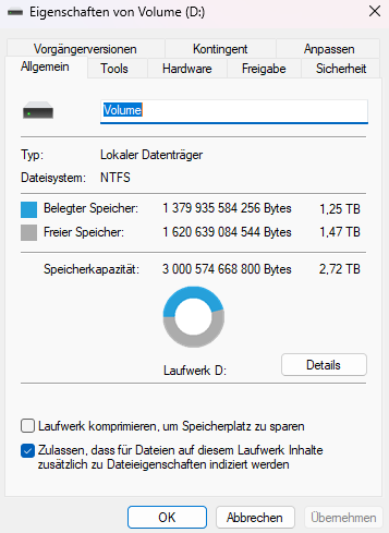 Lade dir Crystal Disk Info hier im Downloadbereich herunter, und mache mal Bilder der SMART Werte der Platte. Das Fenster nach unten grossziehen bis der Scrollbalken verschwindet damit alle Werte sichtbar sind.