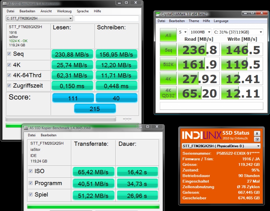 Beim AS SSD Benchmark bekomm ich beim schreiben 22 MB und lesen 170.