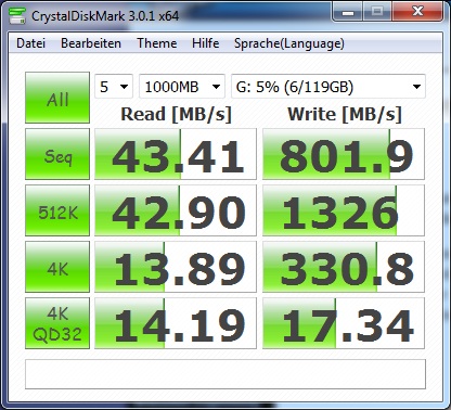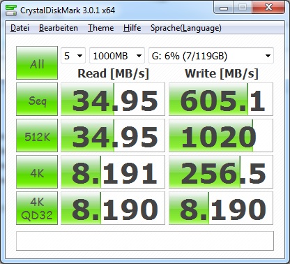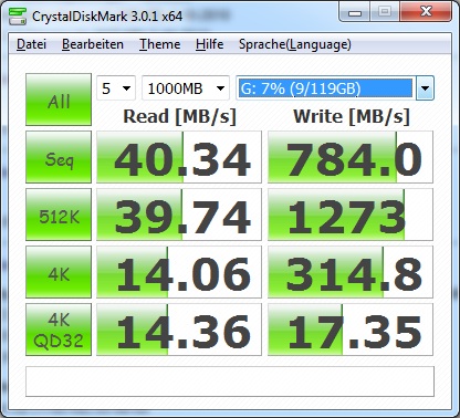 Jedoch musste ich feststellen, dass die Schreibgeschwindigkeit sehr zu wünschen übrig lässt. Unter Windows 7 fällt die Geschwindigkeit auf ca. 40 MB/s (s. Screenshots im Anhang).