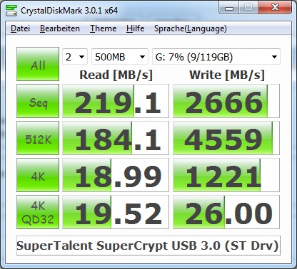 vielleicht weiß jemand bei meinem Problem weiter: Ich habe mir einen Supertalent Supercrypt 128 GB USB-Stick zugelegt, weil dieser laut Computerbase Test wirklich schnell ist.