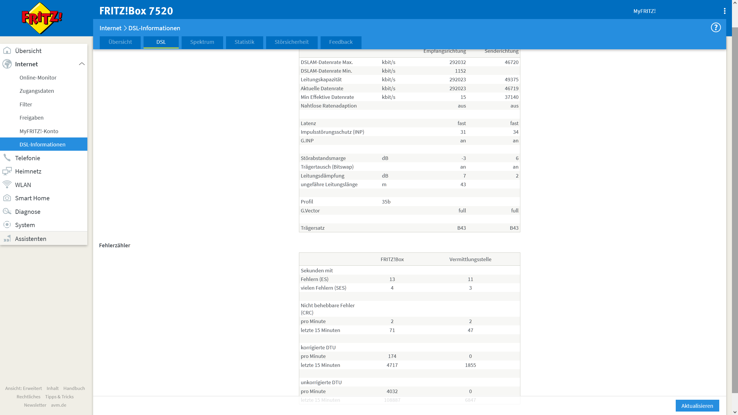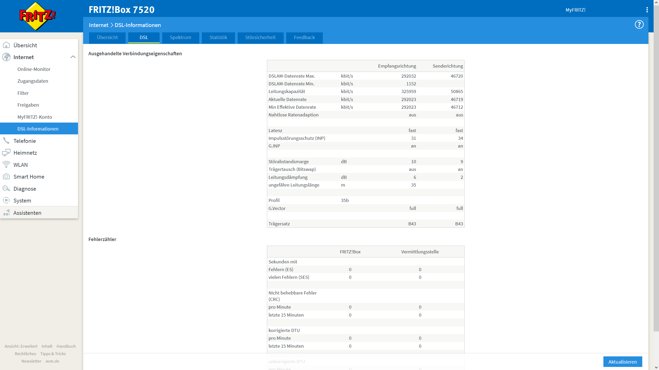 DSL ist verfügbar (DSL-Synchronisierung besteht mit 292023/46719 kbit/s).