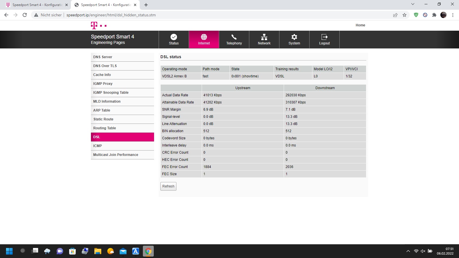 Bei meiner Leitung verstehe ich den Upload null. Im Download habe ich eine Leitungskapazität von 310 Tausend und SNR Margin von 7.1. Also dürfte ich erstmal sicher beim 292 Profil bleiben