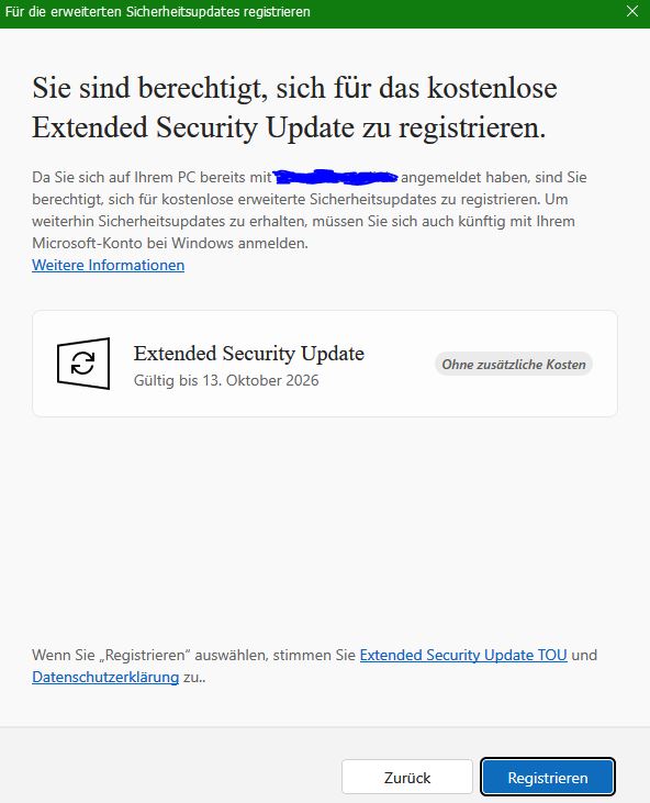 SaltyDog schrieb:Beachte aber, dass du dich regelmäßig mit dem verknüpften MS Konto anmelden solltest, um den ESU-Status zu behalten, sonst wird der nach 60 Tagen zurückgezogen und du musst die Registrierung nochmal von vorne machen (und hoffen dass es geht): https://www.microsoft.com/de-de/windows/extended-security-updates