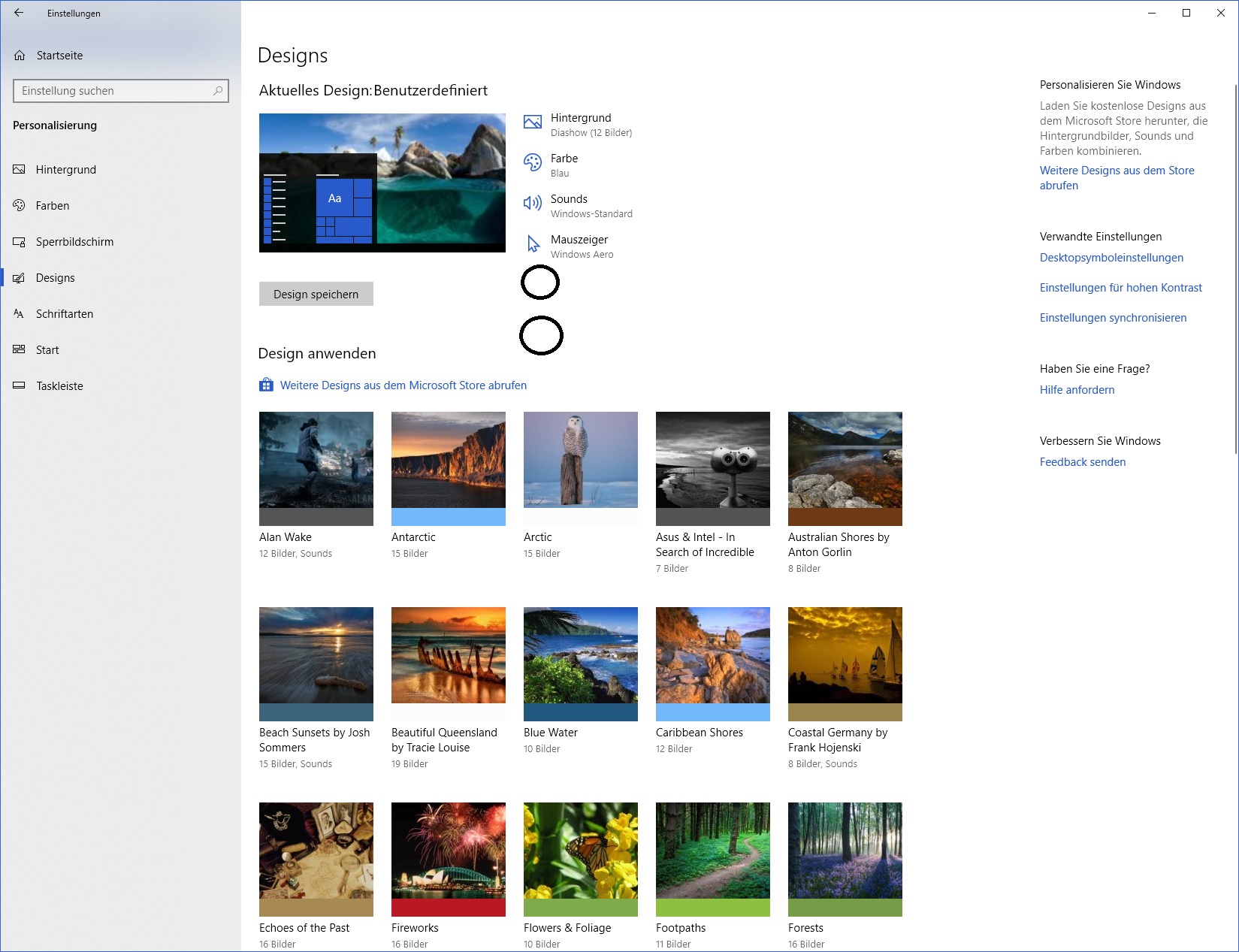 Warum kann man nicht die Desktopsymboleinstellungen und den Bildschirmschoner hier verlinken (markiert auf dem Shot) ? Rechts hat man zwar einen Link, diesen übersieht man aber oft. Und der Schoner ist völlig wonanders zu finden.