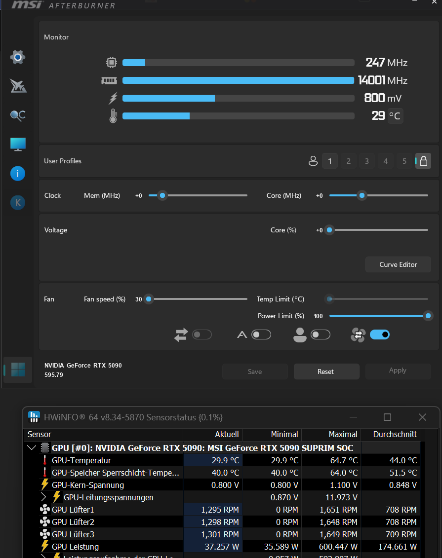 Nach 10 min und etwas mehr als 10 min gesamt Übersicht. Wie geschrieben bekomme ich die Lüfter maximal auf 30% runter mit den Tools die ich kenne, es sei den ich habe was