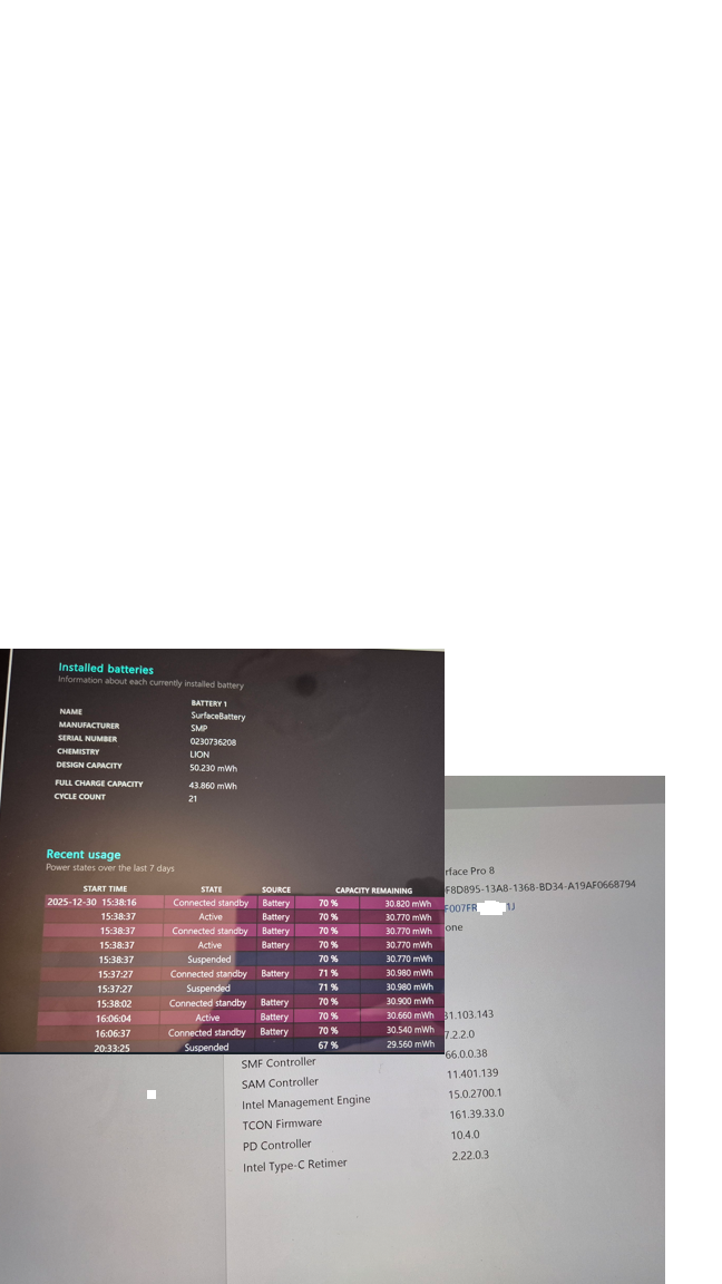 ich habe mein Surface pro 8 gestern erhalten. Es war Windows11 pro installiert und die die Garantie ist in 09/2025 abgelaufen. Der Akkucheck zeigt 21 Zyken an bei 85% Kapazität. Das BIOS wirkt sehr spatanisch.