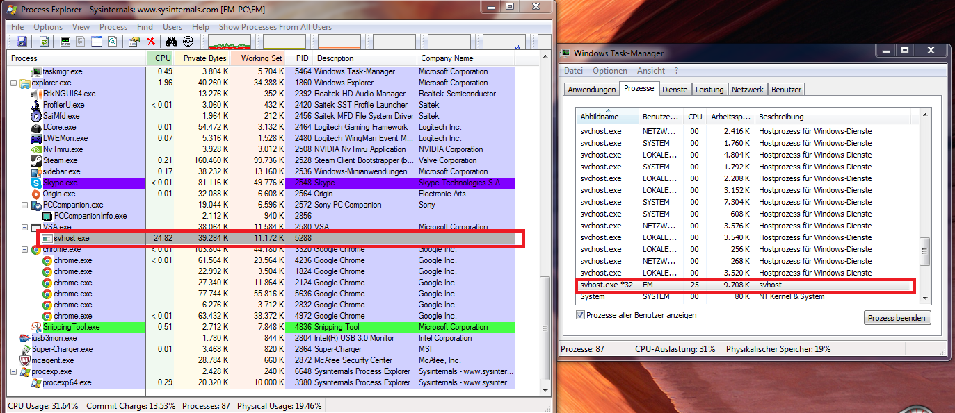 naja hab mich weiter und weiter informiert aber keine ursache gefunden da hinter dem prozess ja dienste stehen...im task-manager finde ich nix und per CMD "tasklist /SVD" hab ich auch nix gefunden....aber mit dem "process explorer" hab ich diesen gefunden.