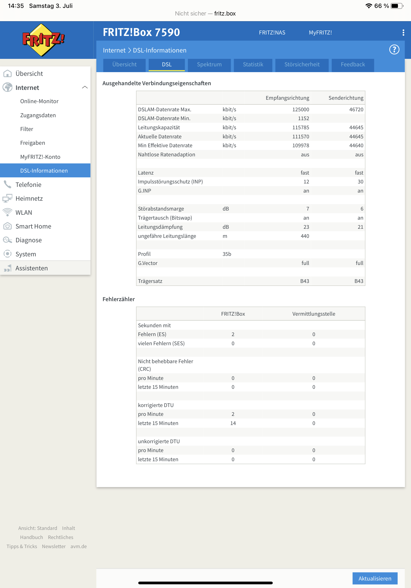Doch dann die Ernüchterung, es kommt laut dem Techniker an die 120Mbits an, und an der FRITZ!Box 7590 werden immer wieder (alle paar Tage/Wochen automatisch) 109-114Mbits durch einen Disconnect synchronisiert.