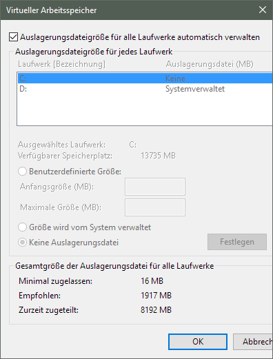 Alle Einstellung sind auf "Windows übernimmt die Verwaltung des temporären Speichers". Ich habe 8gb RAM, eine 60GB SSD und eine große HDD.
