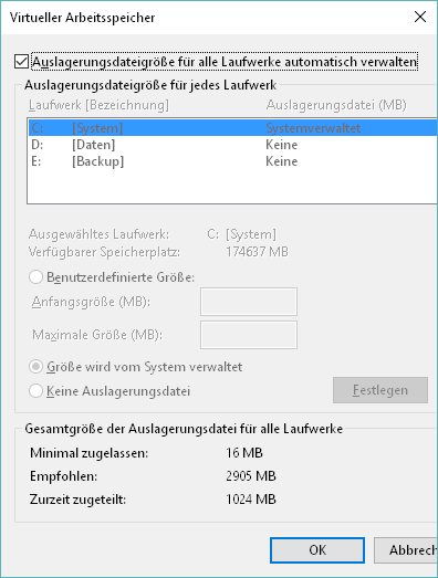 Swapfile Management - Änderungen in Windows 10