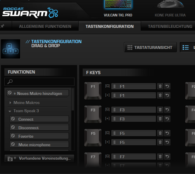 Die Tastenkonfiguration funktioniert nur leider nicht so wie erhofft. Ich habe mir z.B. auf F9 "Mikrofon stummen" gelegt, was aber weder im Spielemodus noch im normalen Modus funktioniert. Nun wollte ich die voreingestellte TS3-Makro nutzen. Allerdings kann ich hierbei nicht mal einer Taste einer Funktion zuweisen (siehe Bild).