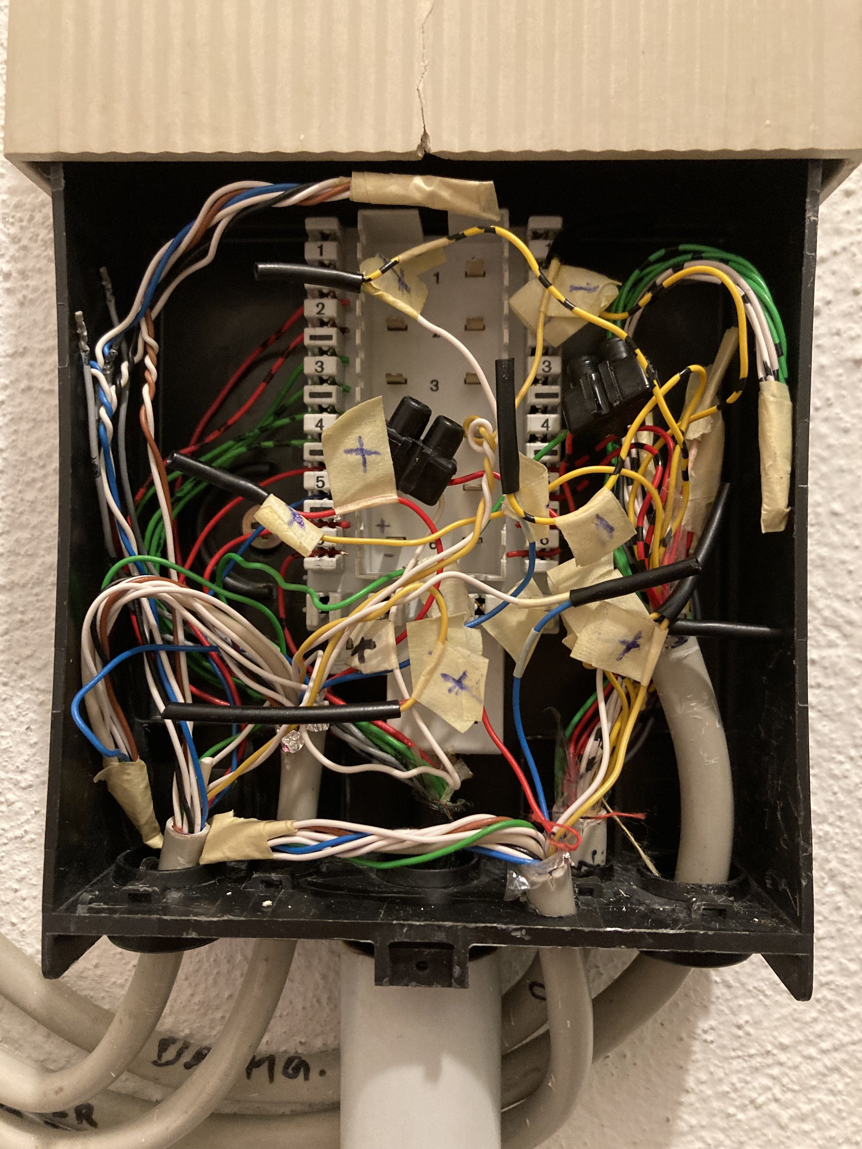 J-2Y(St)Y n×2×0,6 St III Bd - das sind die 20arigen mit Strichen drauf (Telekomkabel) 2 Kabel rechts im Bild hinten. Ich kann dort rote, grüne, graue, gelbe und weisse vierer erkennen, also 20 Adern.