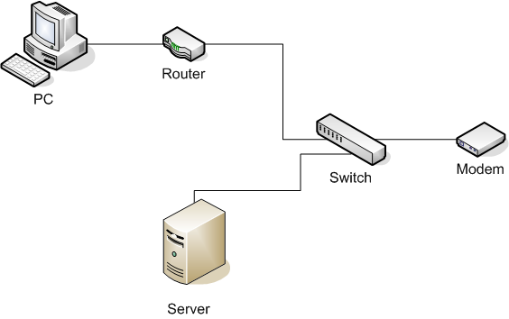 dein Aufbau ist erstmal falsch. Richtig wäre: Modem -> Router -> Switch -> Server / PC