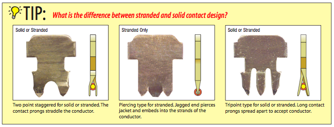 Links und rechts sieht man die Variante für starre Adern (soild). Hierbei werden 2 Kontakte an der Ader vorbei geschoben, dabei wird die Isolierung seitlich abgeschert. Die Ader wird mittig eingeklemmt.