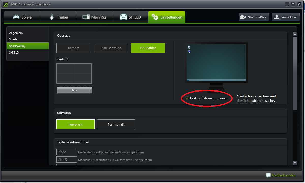 Der Framecounter ist der eigentliche Grund für das Problem nur hatte ich keine Lust den Counter extra immer für den Desktopbetrieb aus zu machen. Darum habe ich die Desktoperfassung aus gemacht und der FPS counter ist immer noch inGame vorhanden.Untitled.png