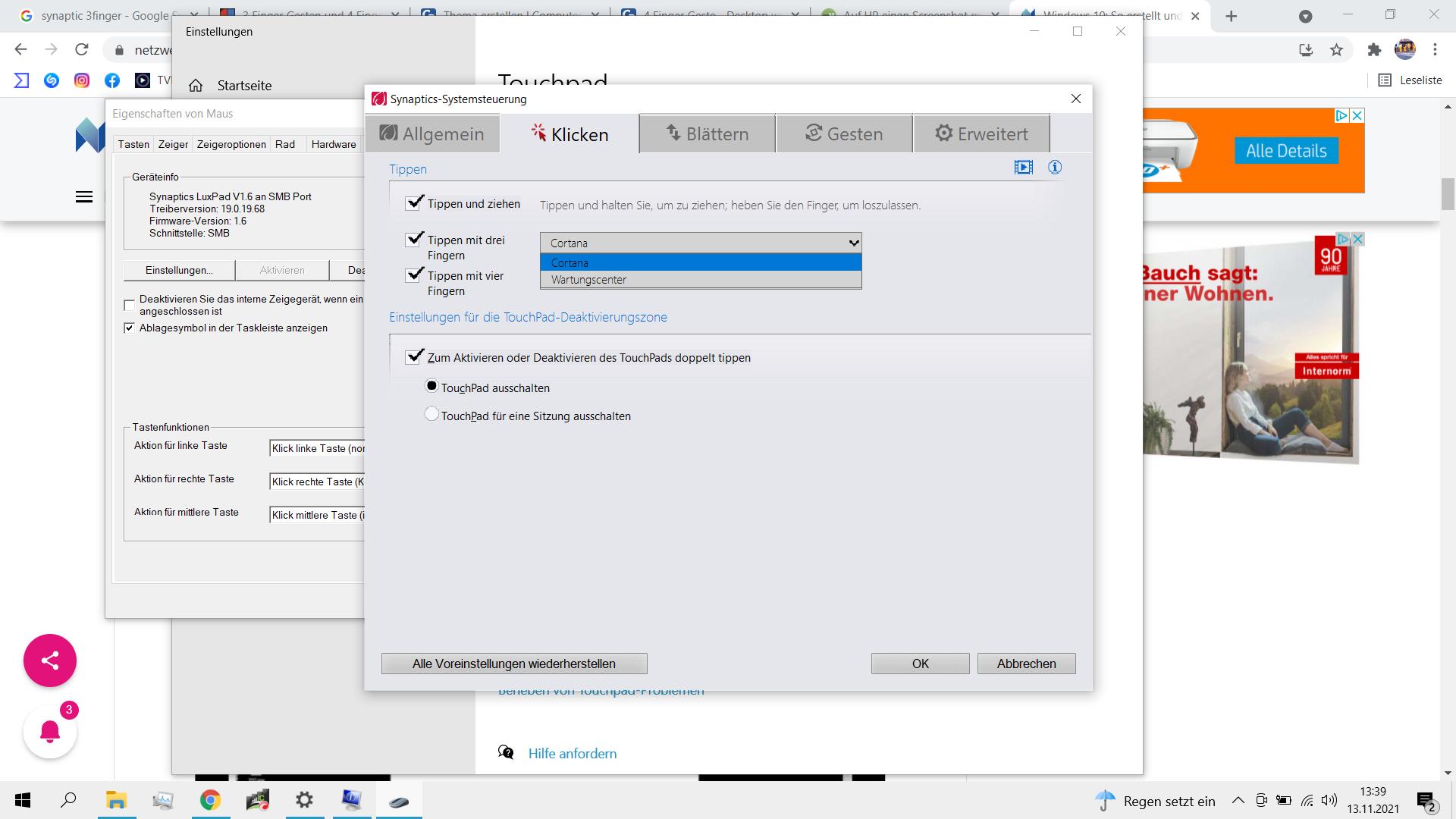 Z.B. bei den Einstellungen fürs Tippen mit 3 und 4 Fingern gibt es nur die zwei Auswahlmöglichkeiten "Cortana" od. "Wartungscenter".
