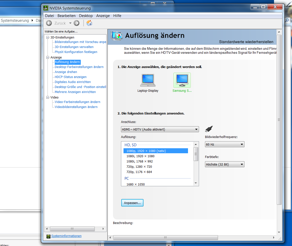 Habe ein Problem bei der Verbindungsherstellung zwischen meinem TV (SyncMaster P2470HD, FULL HD) und meinem Laptop. Möchte mit einem HDMI Kabel (1,5 m lang) mein laptop mit dem TV verbinden. Klappt auch. Nur ist die Auflösung auf dem TV total verpixelt! Einstellungen hatte ich NVidia Kontrollsystem vorgenommen (60 Hz, Farbtiefe 32, 1080p, 1920 x 1080 (nativ). (Siehe Anhang, Unbenannt.pnd)