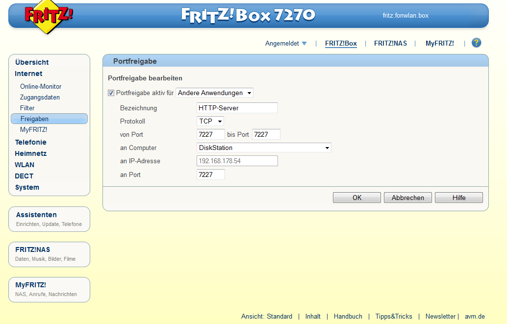 Ich habe die Fritz Box 7270 und bin was Portfreigaben usw angeht ein absoluter Neuling. Habe einen ersten Versuch gemacht