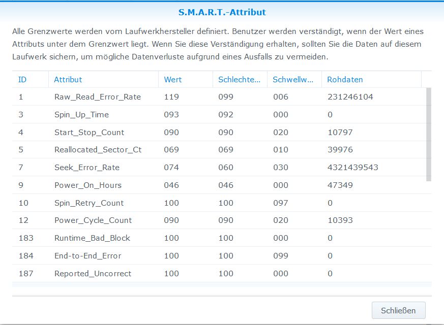 Jetzt zu meiner Frage: Synology gibt mir "43464 fehlerhafte Sektoren für Laufwerk 1 an", aber das sind ja nur die Rohdaten der SMART-Werte, welche man ja nicht 1 zu 1 so übernehmen kann (siehe Screenshots SMART-Werte Laufwerk 1). Es handelt sich um eine Seagate-Platte. Wie genau bemisst Seagate seine SMART-Werte? Also wie viel Bit, wie ist Einteilung in oberer/unterer Bereich und ab wann wird in den oberen Bereich geschrieben?.
