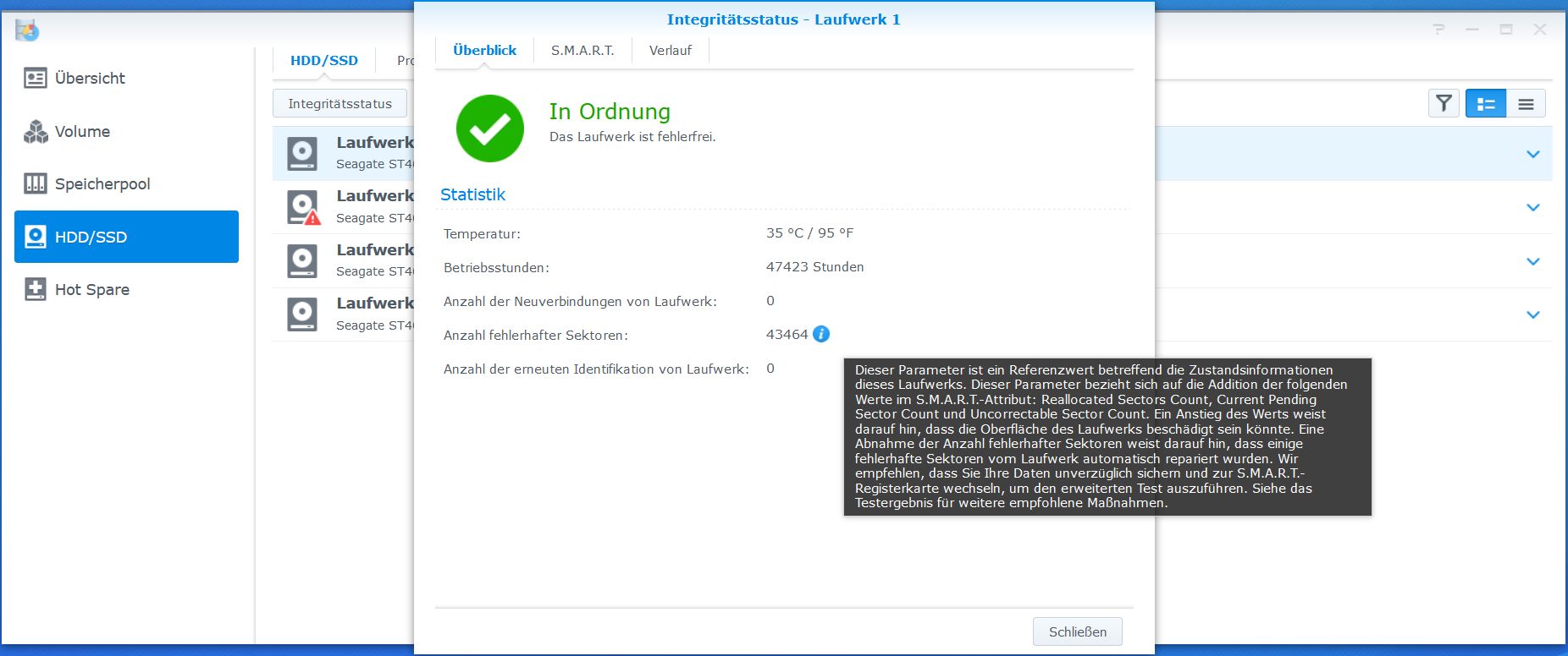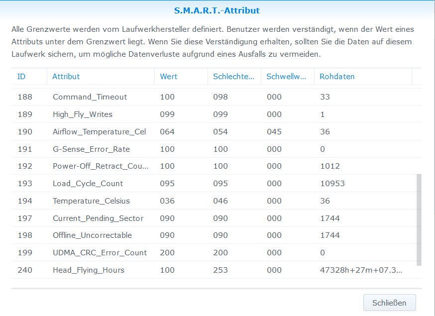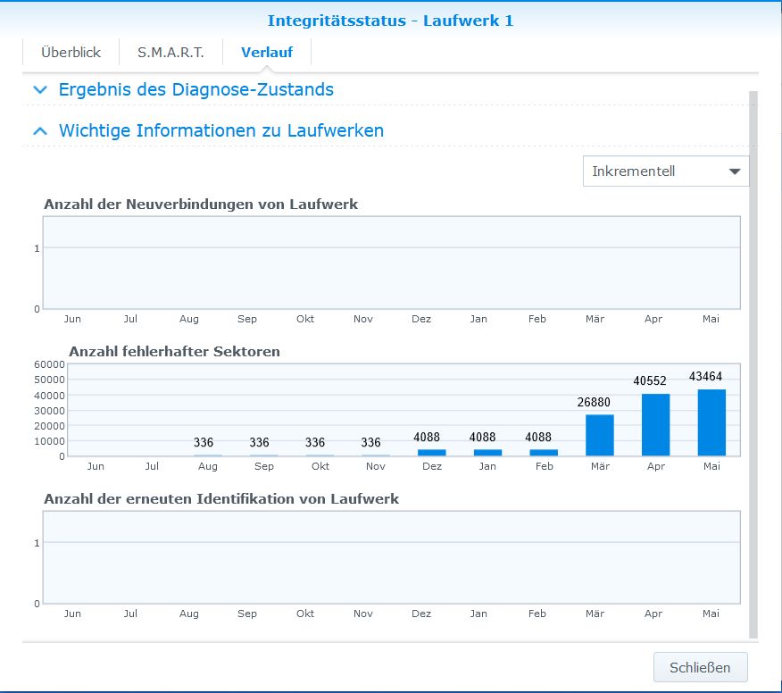 Jetzt habe ich mich durch einige Foren gekämpft und alle berichten davon, dass wenn die Zahl 100 fehlerhafte Sektoren überschreitet man sich Sorgen machen sollte. Die Anzahl ist in den letzten Monaten gestiegen (siehe Screenshot Verlauf) aber soweit laut Synology OS noch alles "in Ordnung" (siehe Screenshot Übersicht).