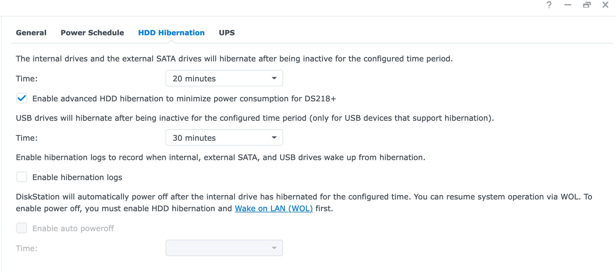 - Die Hybernation-Settings in Synology DSM sind ebenfalls wie vorher auch (= nach 20 Minuten Inaktivität sollten die Platten in den Hibernation / Ruhemodus gehen)