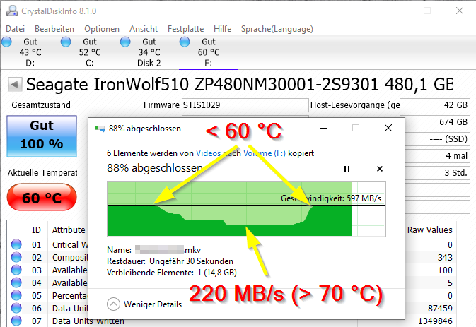 Nach dem Hinweis von @mgutt habe ich mir das SSD Verhalten noch einmal angeschaut. In einem offenen Aufbau, ohne aktive Kühlung (also weder Lüfter noch Kühlkörper) erreicht die SSD kritische Temperaturwerte und drosselt die Geschwindigkeit massiv.