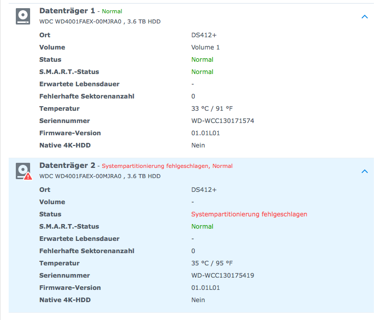 ich habe heute morgen bei meiner 412+ (2x4TB WD4001FAEX Black als RAID1) erstmals mit Piepston die Fehlermeldung erhalten: "Systempartitionierung fehlgeschlagen". Ich habe einen SMART Schnelltest machen lassen, kann aber damit nichts anfangen. Beide Platten liefen seit 5 Jahren ohne Probleme durch, bis heute morgen. Die Frage ist jetzt, sollte ich die eine Platte ersetzten und kann ich dies einfach so durch einen Tausch machen oder muss ich erst den Verbund auflösen?