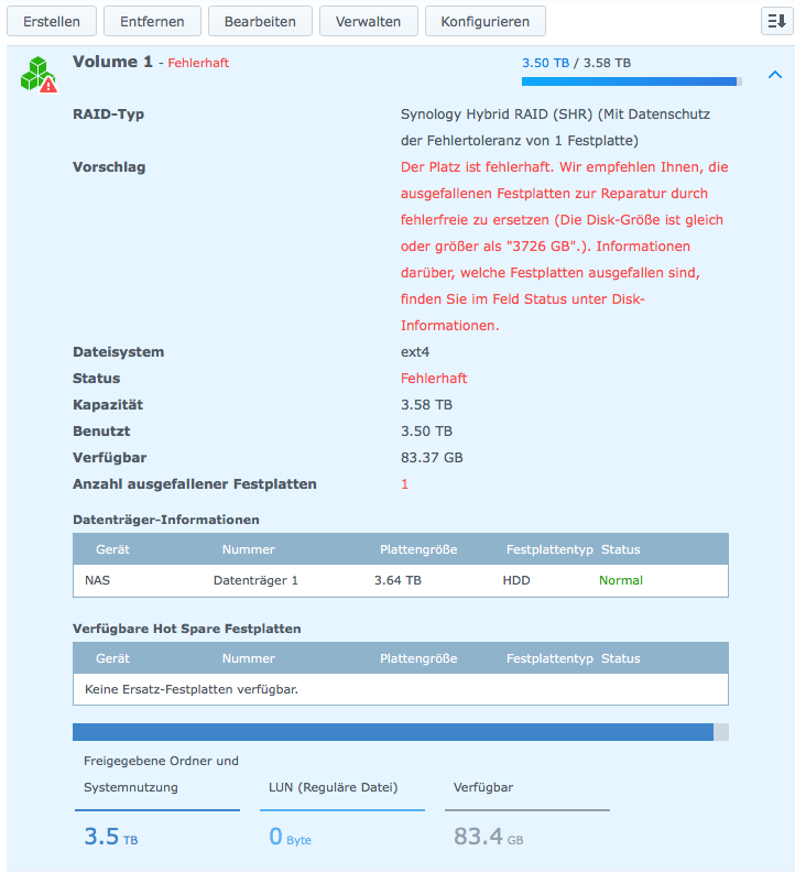 Kann sie dadurch kaputt gegangen sein, weil die Volumes schon längere Zeit zu voll waren? Seit einem Jahr auf 99%, jetzt 98%. Wollte in diesem Sommer auf 918+ umsteigen, weil ich echt keinen Platz mehr habe. Finanziell kann ich aktuell nur die eine Platte tauschen, wenn dies notwendig ist.