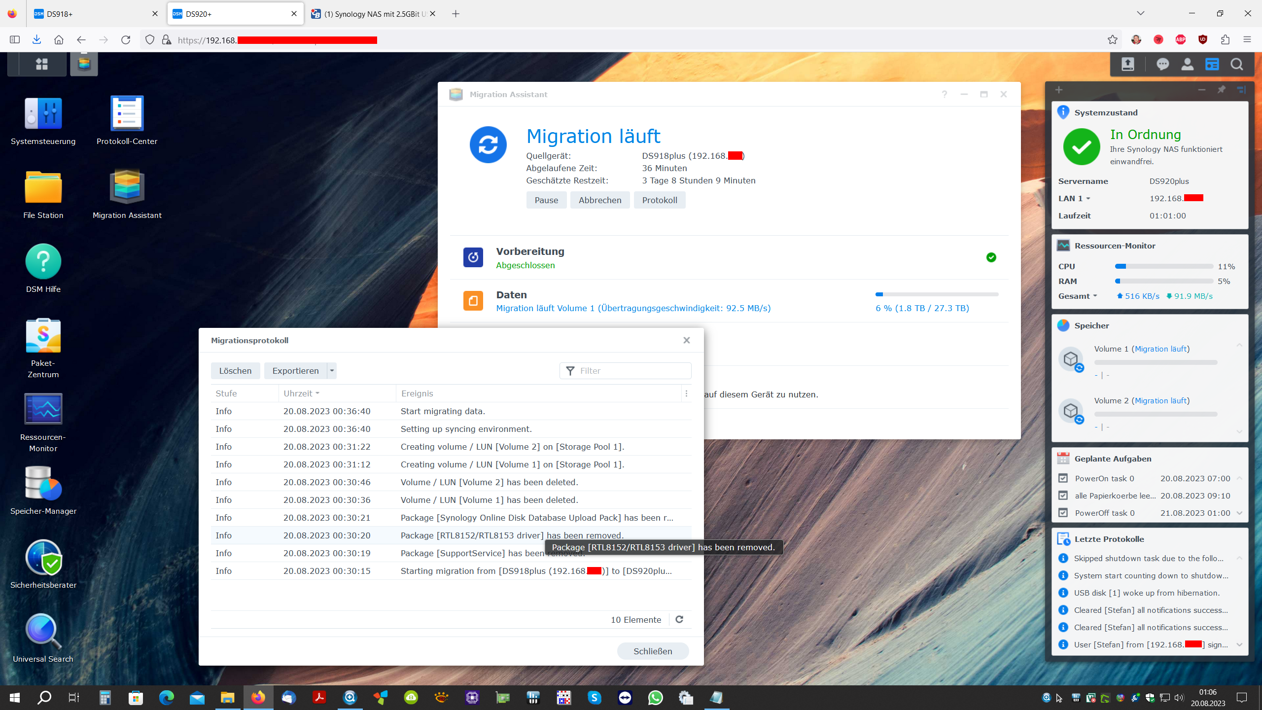 Von praktischem Wert ist das aktuell eher nicht. Nachdem ich mich doch entschlossen hatte, das DS920+ mit größeren Platten auszustatten und vier Stück 16TB Seagate IronWolf Pro (ST16000NT001) eingetrudelt waren, wollte ich mittels Migrations-Assistent alle Daten und Einstellungen vom alten auf das neue NAS übertragen.
